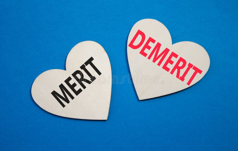 Símbolo de Mérito ou Demérito. Conceito da palavra Mérito ou Demérito em corações de madeira. Lindo fundo azul. Negócios e Mérito. Conceito de negócios e Mérito ou Demérito. Espaço para cópia.