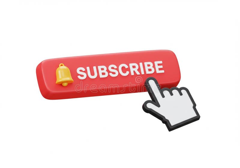 Botão de Assinatura de Composição 3D com Ícone de Célula Clicar em Conceito Ilustração. Ilustração renderizada 3D com um botão SUBSCRIBE retangular vermelho com texto branco. Um ícone de sino amarelo está situado no lado esquerdo da tecla. Um cursor estilizado com um dedo apontador paira perto do botão, sugerindo uma ação de clique. O projeto transmite um conceito de interações de assinatura on-line, muitas vezes usadas em sites ou plataformas de mídia social para indicar notificações. O plano de fundo é branco simples, enfatizando os elementos do botão e do cursor.