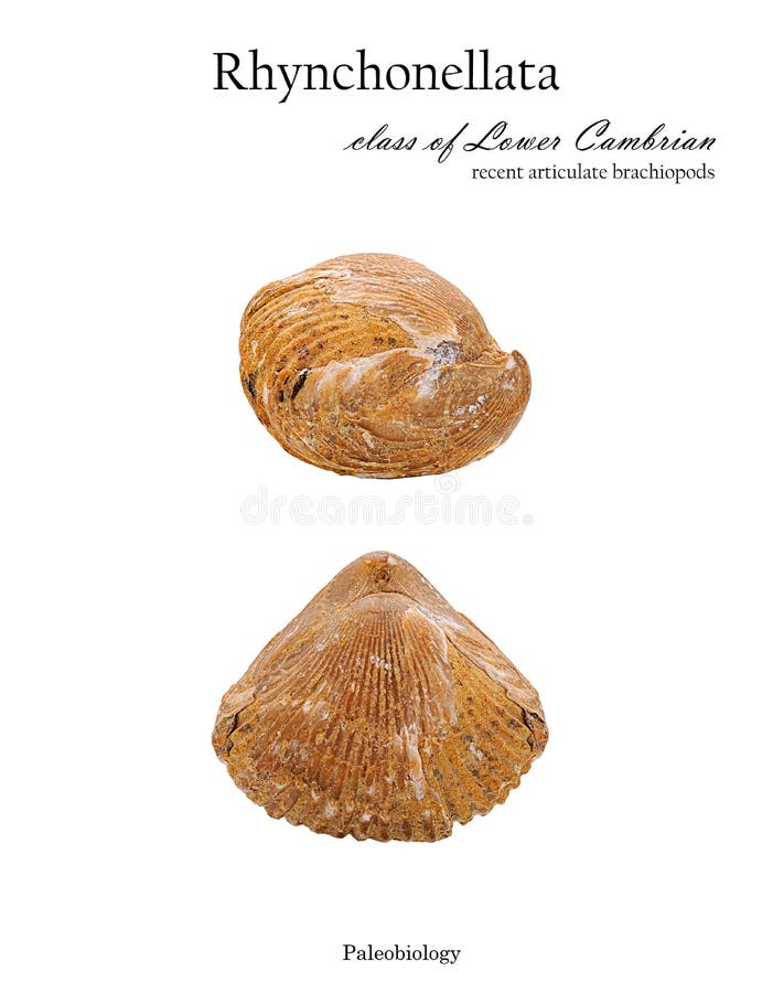 Casca fóssil de molusco rhynchonellata isolada de cima e de lado isolada em branco