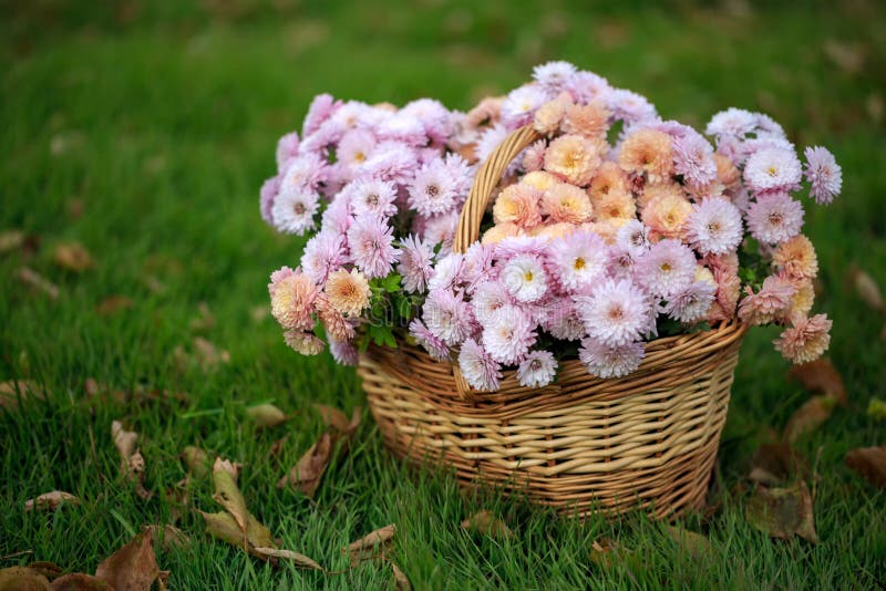 Cesta com flores do outono. A cesta com outono floresce em um prado verde