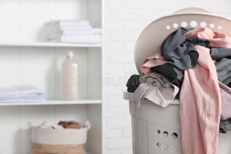 Cesto de roupa de plástico com roupa no interior. espaço para texto