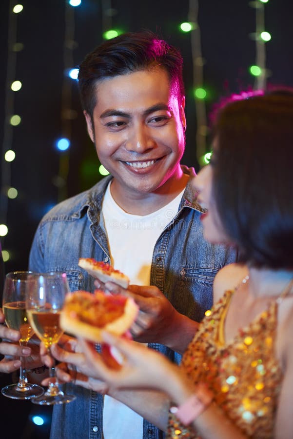 Flirtying no partido. Homens vietnamianos consideráveis que comem petiscos e que flertam com as mulheres bonitas no partido