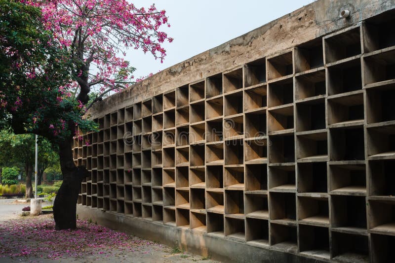 Árvore com flores cor-de-rosa perto da parede com células em Chandigarh, Índia