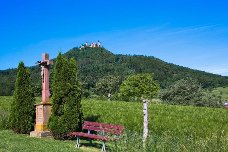 Vista panorâmica do percurso pedestre que leva à montanha Rtanj, exibindo uma vegetação exuberante e céus dramáticos imagem de stock Vista panorâmica do percurso pedestre que leva à montanha Rtanj, exibindo uma vegetação exuberante e céus dramáticos