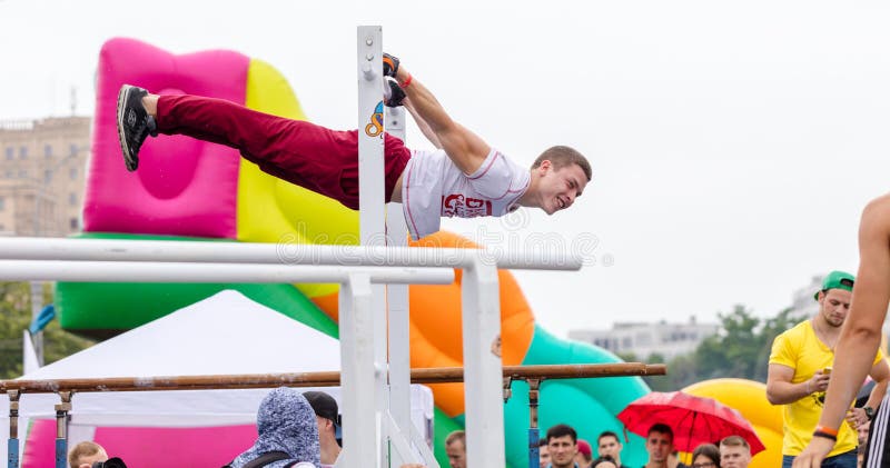 O homem executa um truque. Kharkiv, Ucrânia - 11 de junho de 2016: O homem executa um exercício de Barstylers da batalha do truque no quadrado da liberdade em Kharkov