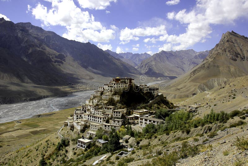 Gompa de Key ao Sol. O Majestoso Mosteiro Budista Tibetano de Key (Gompa de Key) construído no topo de uma colina com vista para a serena paisagem do Vale de Spiti e do Rio Spiti, nas altas montanhas do Himalaia Indiano. Tirado em: Gompa de Key, Key, Vale de Spiti, Himachal Pradesh, Himalaia Indiano, Índia
