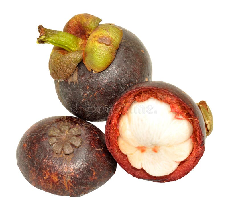 Mangustão roxo fresco. Fruto roxo tropical maduro do mangustão isolado em um fundo branco