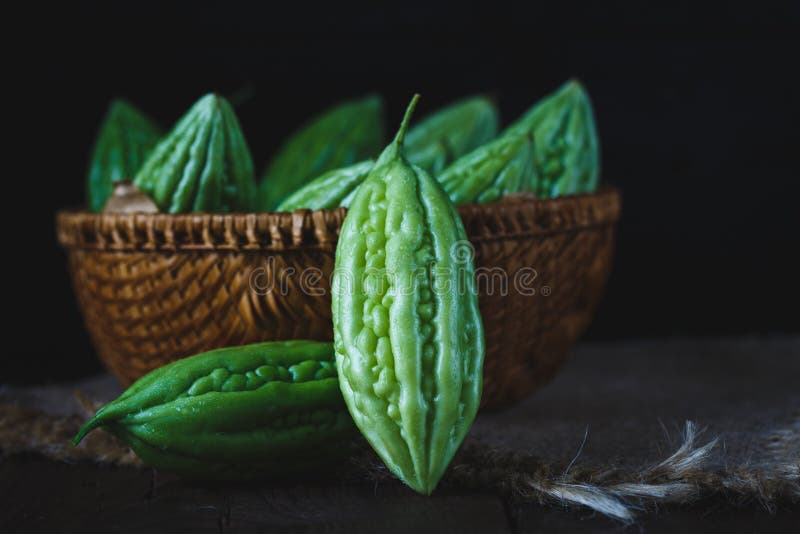 Melões amargos verdes na madeira velha