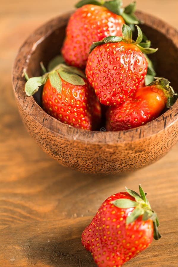 Morangos na bacia de madeira. Morangos frescas na bacia de madeira