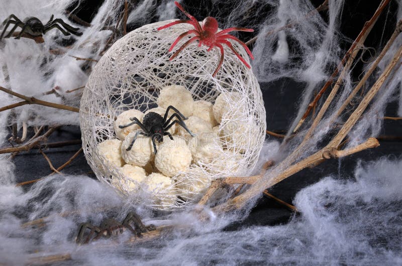 Ovos da aranha em um casulo. Os doces sob a forma da aranha eggs em um casulo com uma aranha na tabela para Dia das Bruxas