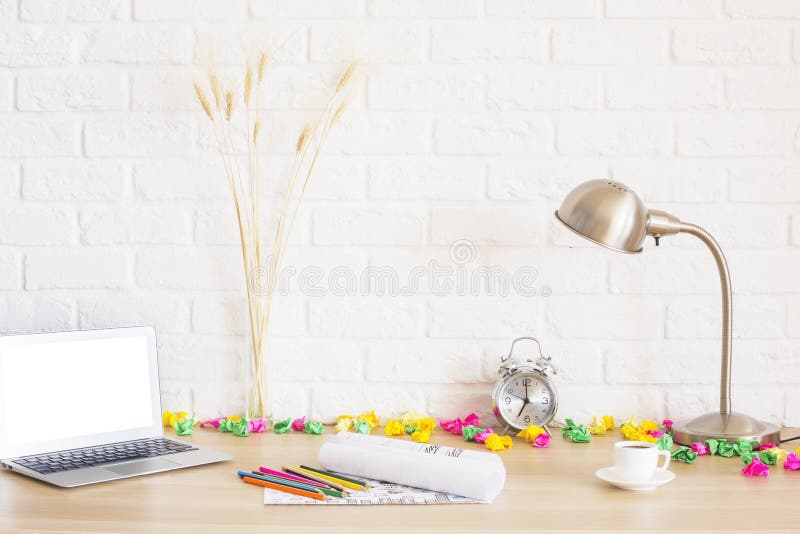 Portátil e papel amarrotado. Desktop de madeira criativo com a tela branca vazia do portátil, as bolas de papel amarrotadas coloridas, o alarme, o copo de café, a lâmpada, os pontos do trigo e os outros artigos no fundo da parede de tijolo Zombaria acima