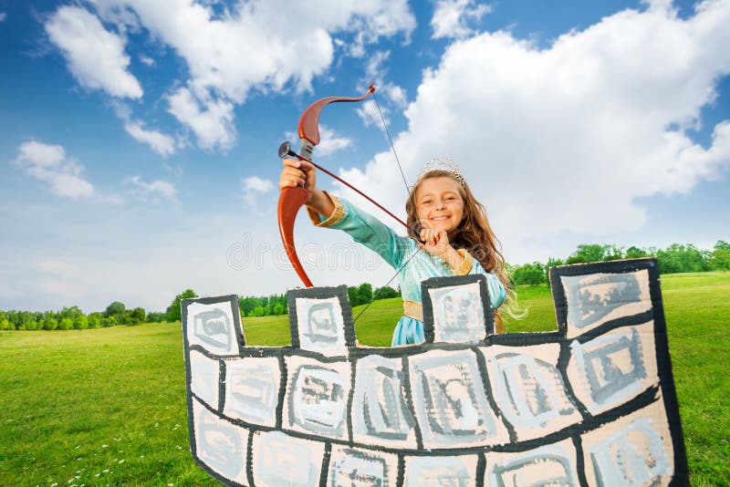 Princesa com tiro da curva da torre tirada. Menina da princesa com a seta do tiro da curva da parte superior da torre tirada da caixa