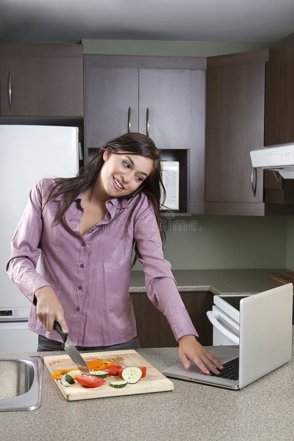 Cortar, clicar, conversar. Uma jovem a tentar cortar legumes enquanto trabalha num portátil e fala ao telemóvel