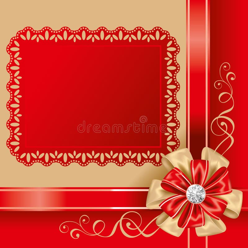 Fundo festivo. Caixa de presente decorada no topo com um rosetão vermelho e dourado e um diamante