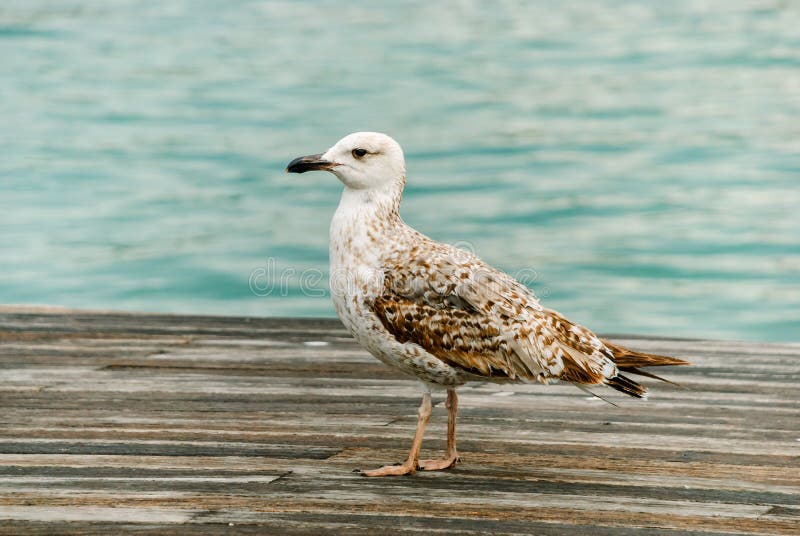 Gaivota grande com. Porta em Barcelona Gaivota em um passeio de madeira contra o mar de turquesa