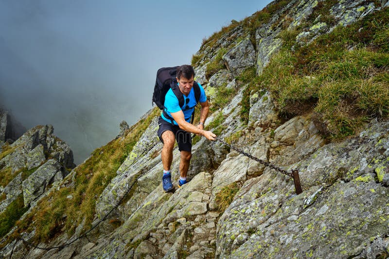 Hiker com mochila nas montanhas