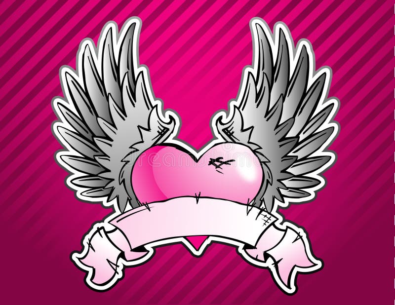 Tatuagem de Coração Rosa. Coração rosa com asas cinzentas e um pergaminho sobre um fundo listrado com cores degradê
