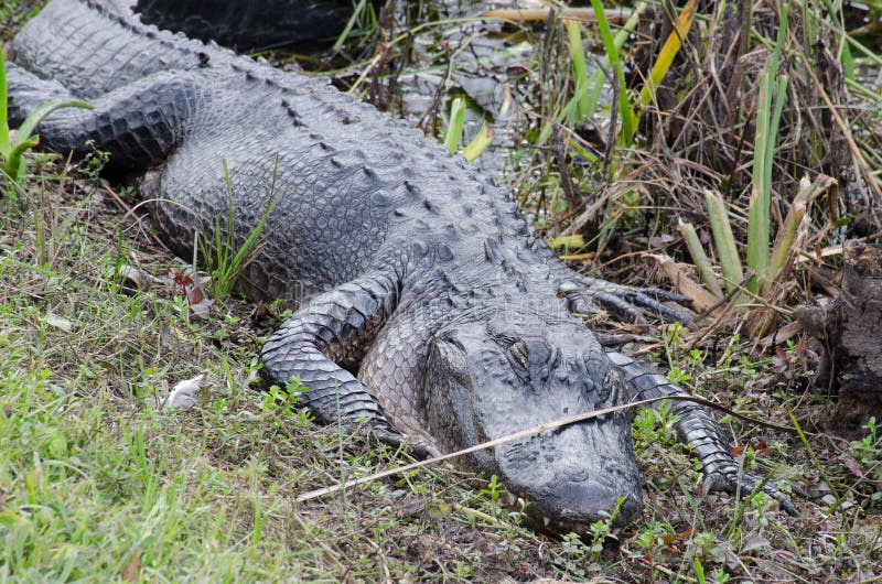 Um jacaré adormecido. Um jacaré gordo adormecido no centro de visitantes do Vale dos Tubarões, no Parque Nacional Everglades, Flórida, EUA