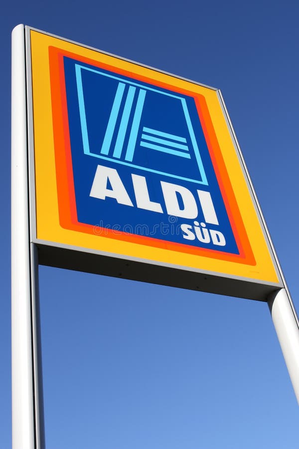 Aldi sinal contra céu azul. Divisão Sul - Aldi é uma das principais cadeias globais de supermercados de desconto, com quase 10. 000 lojas em 18 países.