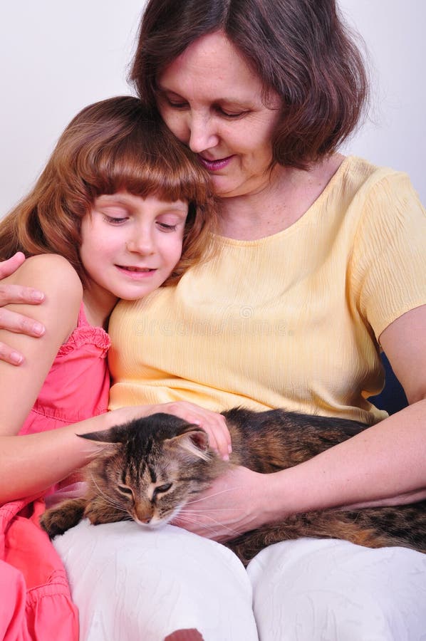 Avó e neta com o seu gato. Retrato aproximado de uma avó e neta sorridentes e felizes com o seu gato