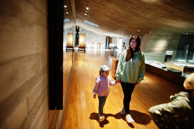 Mãe com filhos a explorar exposições em salas de museu