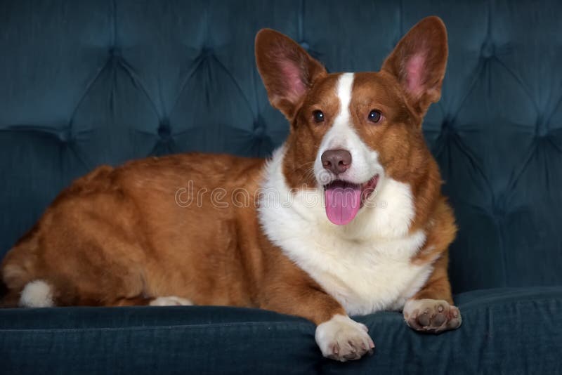 Mentiras de corgi branco e vermelho. Corgi vermelho com branco está em um sofá