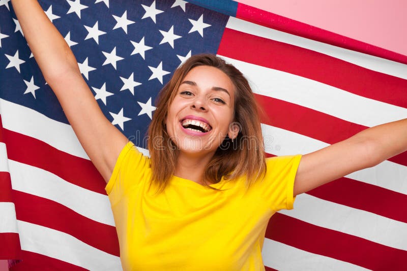 Mulher alegre com bandeira dos EUA. A mulher feliz de sorriso com EUA embandeira o sentimento alegre e a vista da câmera