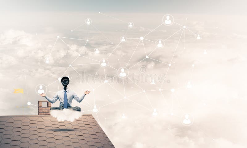 O conceito da segurança e da proteção de privacidade com câmera dirigiu o miliampère. Homem de negócios sem cara com zumbido da câmera em vez da cabeça que senta-se na pose dos lótus