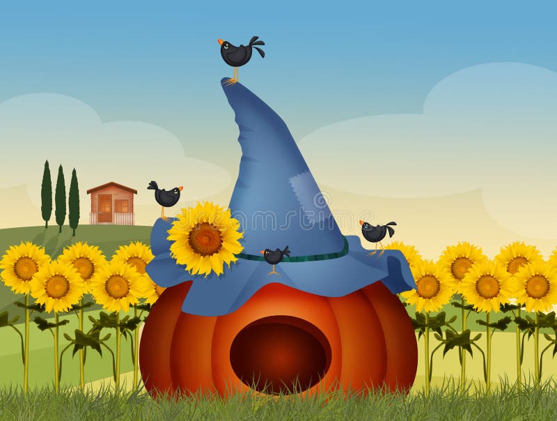Os corvos comem a abóbora. A ilustração engraçada dos corvos come a abóbora