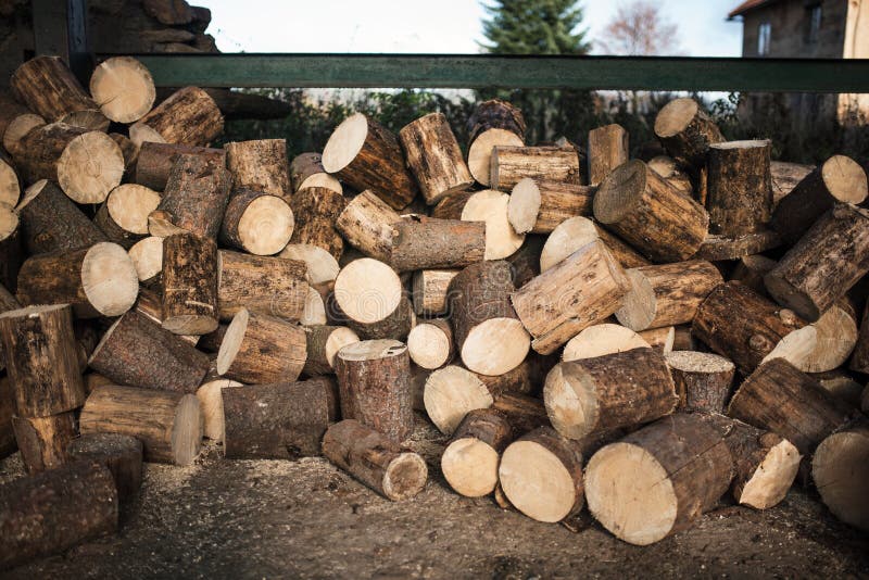 Pilha de lenha num monte Pilhas de coníferas e de decepção de lenha