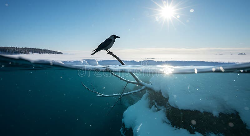 Polegadas solitárias sobre um galho acima da superfície da água congelada à luz do sol brilhante do inverno. Dramatic split view captura um corvo empoleirado sobre um lago soreno congelado sob brilhantes naturezas de inverno exibindo naturezas embaçadas beleza e resiliência silenciosa.