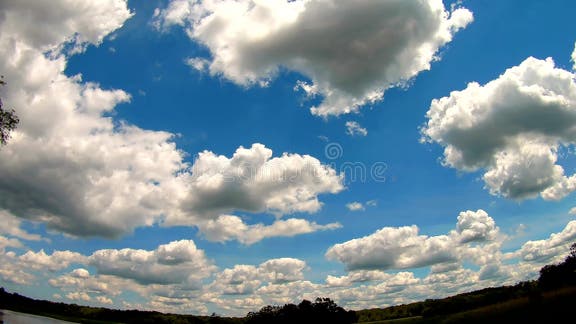 Céu azul com nuvens, lago Tempo real. Céu azul com nuvens, lago Reflexão do lago do céu do tempo real das árvores